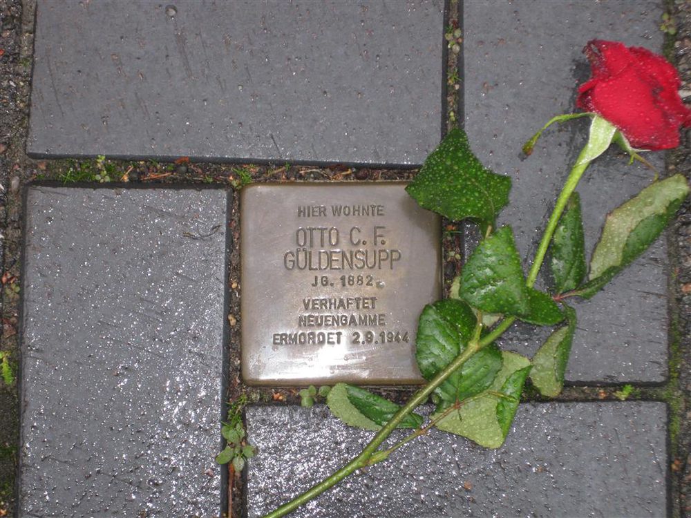 Otto Carl Friedlich Güldensupp wurde am 2 September 1944 im Konzentrationslager Neuengamme ermordet. Sein Leichnam wurde, wie zu dieser Zeit üblich, im Neuengammer Krematiorium engeäschert- auch um alle Spuren der Behandlung eines Gefangenen zu beseitigen. Das Standesamt Neuengamme, eine lagerinterne Tarneinrichtung der SS, versandte die Urne schließlich nach Oldenburg in Holstein, wo sie am 5 Oktober 1944 ohne Grabstein beigesetzt wurde.
